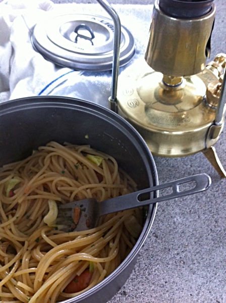 パスタには別途ソースや具の調理が必要である。最近はレトルトのソースがあって、ゆでたパスタに絡めれば出来上がるまことに便利なものがある。が、野菜や肉などの具も多少は入れたいときもあるだろう。そうなるとコンパクトストーブ一つでは少々具合が悪いので、ずっと躊躇していたのだった。