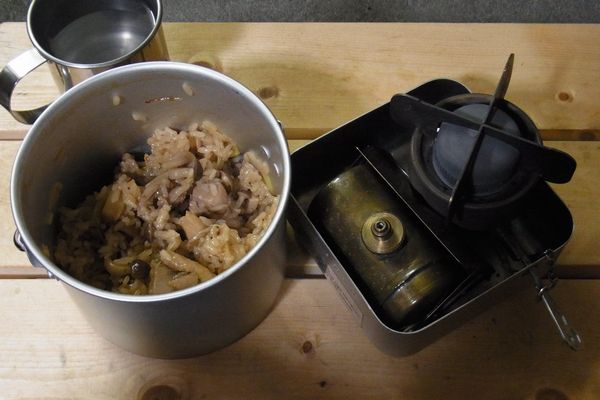 オプティマス199レンジャーを使用。コッヘルはDUGの焚き火缶S。焚き火缶は、「焚き火」というだけあって、つるして使うのが前提のつくりで、取っ手がバケツ状の形状になっている。フライパンとして使えるふたも、側面に角度がついているため、取っ手が少々妙な感じ。慣れれば何とかなるけどね。