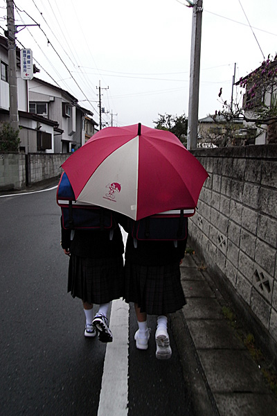 そんな親の不安をよそに、双子の娘は相合傘で楽しそうに下校中。親はゲットしたてのR8を取り出して、そんな双子をパチリ。..........親よ、本当に不安なのか?