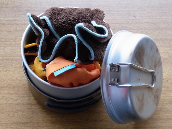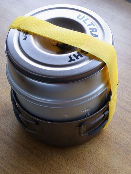 ふと思いついて、EVERNEW Titan Ultra-Light Cooker Mセットの小(900ml)を、TREK 1400の底にはめてみた。笑っちゃうほどぴったりだ。