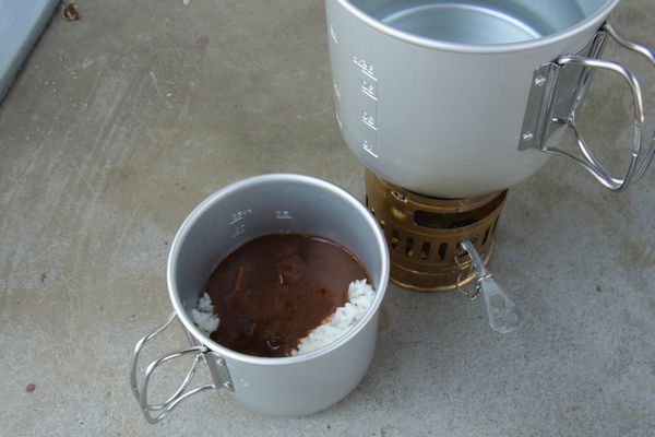 昼すこし前に、コッヘルに無洗米と水を入れておき、しばし放置(仕事)。で、昼休みの時間に、SVEA 123Rを取り出して炊飯。炊けたらすぐに別のコッヘルで湯を沸かして、レトルトカレーを温める。蒸らしはそのあいだに終わるので、ご飯の入ったコッヘルにカレーを投入してできあがり。