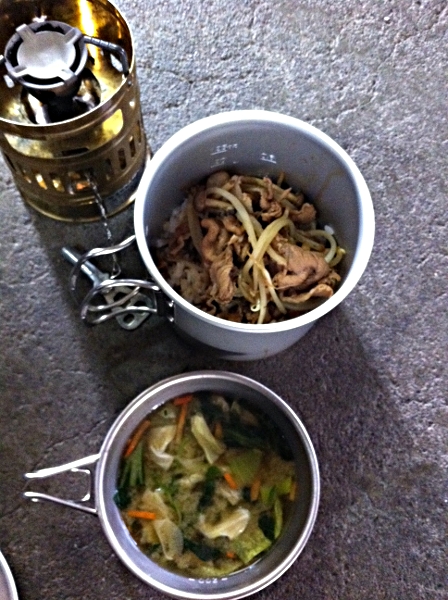 段取りは、小コッヘルで飯を炊き、蒸らしている間に大フタのフライパンを使って豚肉ともやし、ぶなしめじをごま油で炒めて、モランボン「豚丼のたれ」で味付け。仕上がったらご飯にぶちまける。で、シェラカップでお湯を沸かしてフリーズドライのみそ汁を作る。これだけ。